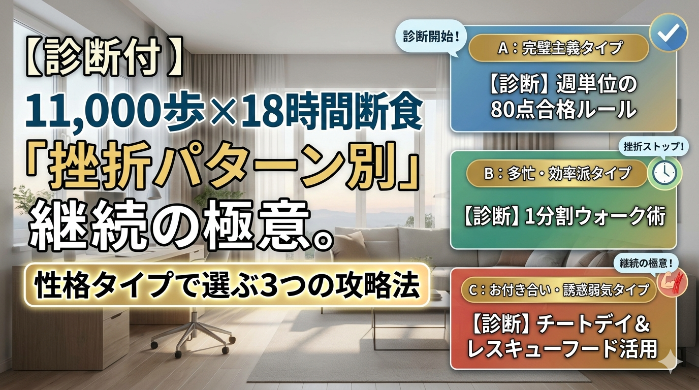 Q2:「多忙・効率派タイプ」ですが、仕事の会食が多くてスケジュールが組めません。 A2:スケジュールを「固定」せず「優先順位」で動くのがコツです。 会食がある日は「18時間断食」を「12時間」に短縮しても構いません。その代わり、移動時間をすべて「早歩き」に変えて歩数を稼ぐなど、その日の状況に合わせて魔法の習慣を組み替える「柔軟な戦略」こそが、忙しい方の成功法則です。