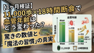 健康的な生活習慣 【3ヶ月検証】11,000歩×18時間断食で血管年齢はどう変わった?驚きの数値と「魔法の習慣」の真実 11,000歩×18時間断食を90日間続けた驚きの結果を公開!実年齢+〇歳だった血管年齢はどう変わったのか?体重・体脂肪の推移から、脳が冴えわたる「オートファジー」の真実まで、忖度なしの検証データを全公開。あなたの健康投資を加速させる実録です。 2026.04.06 健康的な生活習慣魔法の生活習慣